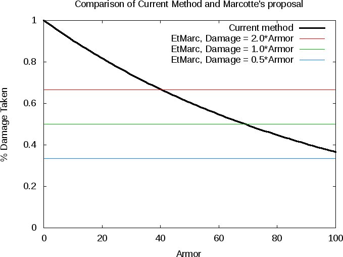 using alpha = 0.02 (for comparison)As you can see, both the "tiger_eye" method and the "marcotte" method behave similarly such that the larger the input damage compared to the armor, the more % damage will be done. Conversely, if input damage is small compared to the armor, the less % damage will be done. We both seem to like this behavior